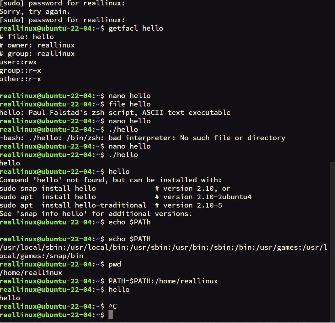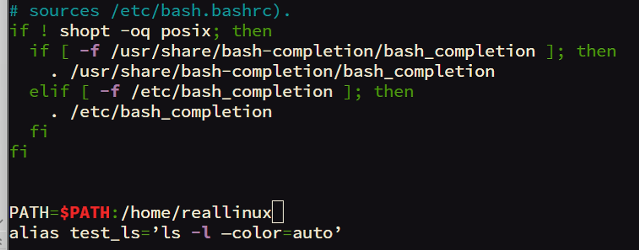 ~/.bashrc 파일의마지막 라인에 PATH=$PATH:/home/realinux 를 추가하면 새롭게 열린 bash/shell 에서도 PATH 정보를 확인해서 home/realinux 를 찾을 수있다.