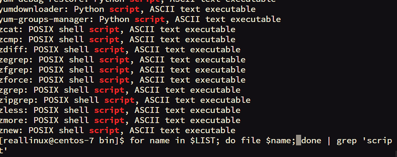 제시하신 명령어는 LIST 변수에 저장된 파일 목록을 순회하면서 각 파일의 타입을 file 명령어로 확인하고, 그 결과 중에서 ELF 파일을 제외하는 작업을 수행합니다.