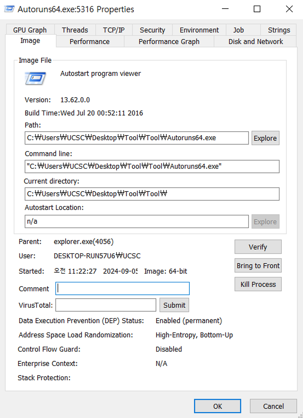 악성파일이 실행된 경로, TCP/IP 해당 프로세스가 네트워크 행위가 일어나는지, 프로세스가 동작을 했을때 정보수집을 해서 외부로 보낸다고 가정하면 TCP/IP에 정보가 나옴, String 을 통해 프로그램이 가지고 있는 문자열 정보도 확인 할 수 있다. , Thread ID 도 확인 가능