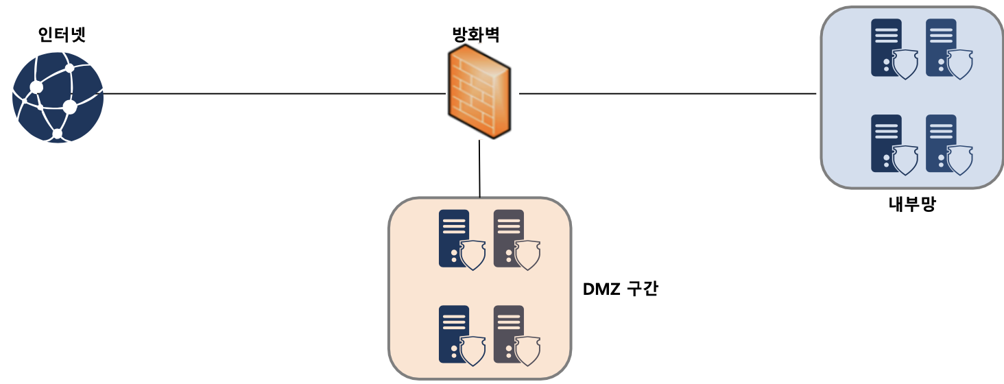 DMZ 구간 : 인터넷과 내부망 구간사이에 위치한 중간지점으로 침입차단시스템 등으로 접근제한 등을 수행하지만, 외부망에서 직접 접근이 가능한 영역으로 외부에서 서비스 제공 시, 내부 자원을 보호하기 위해 내부망과 외부망 사이에 접근제한을 수행하는 영역