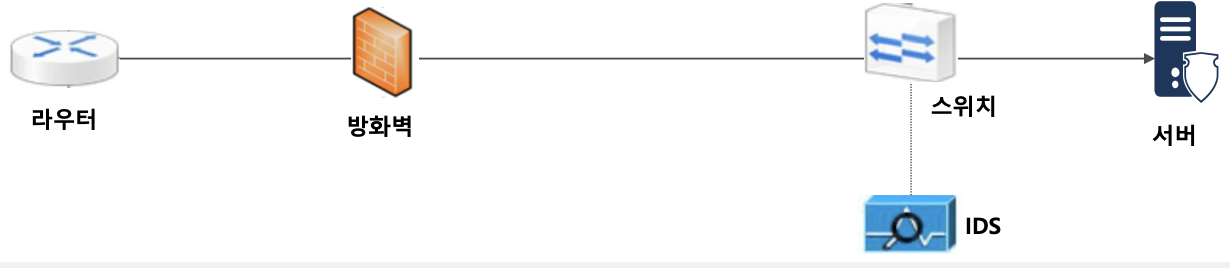 - 물리적 회선 구성에 미러링 장비를 통해 유입된 트래픽을 분석하는 방식 (데이터가 스위치에서 서버로만 가는게 아니라 IDS 한테도 전송된다 -> IDS 는 데이터를 받고 쌓아서 "탐지"만 한다
