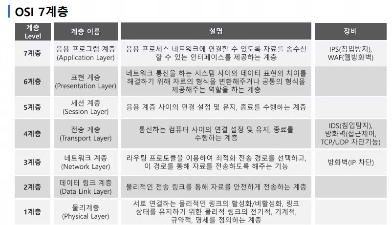 - 1계층 케이블 / 2계층 MAC / 3계층 IP / 4계층 PORT