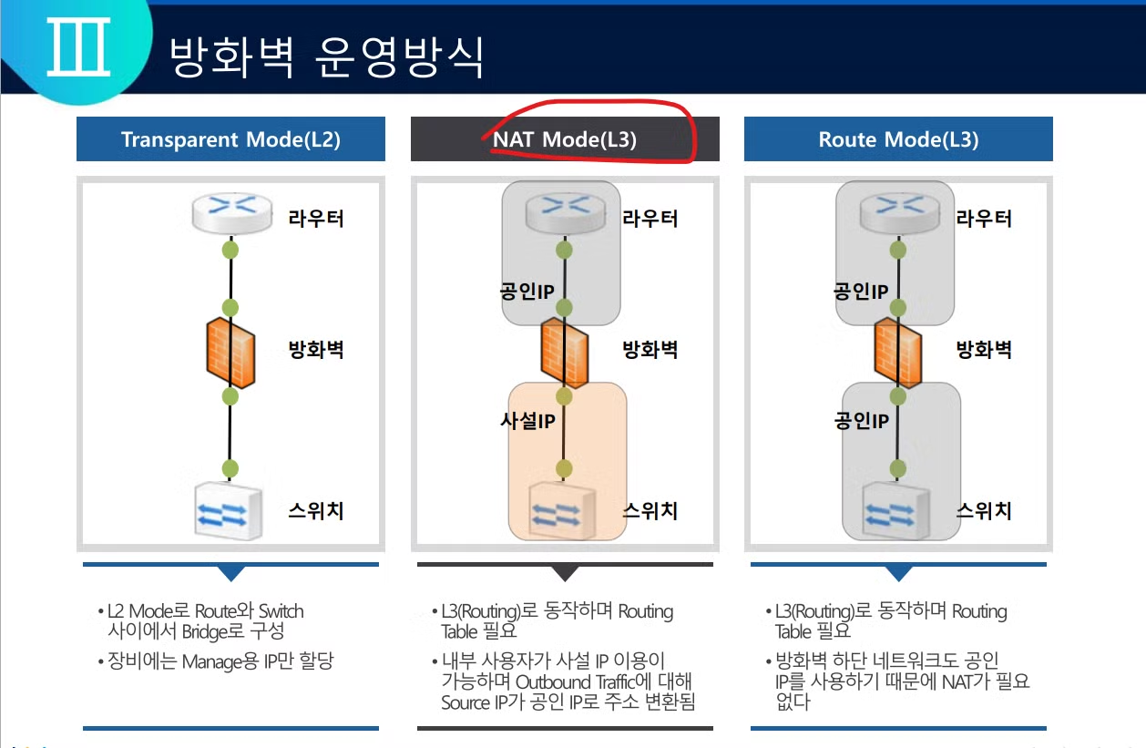 방화벽 운영방식 - (NAT 방식이 가장 많이 사용된다.)