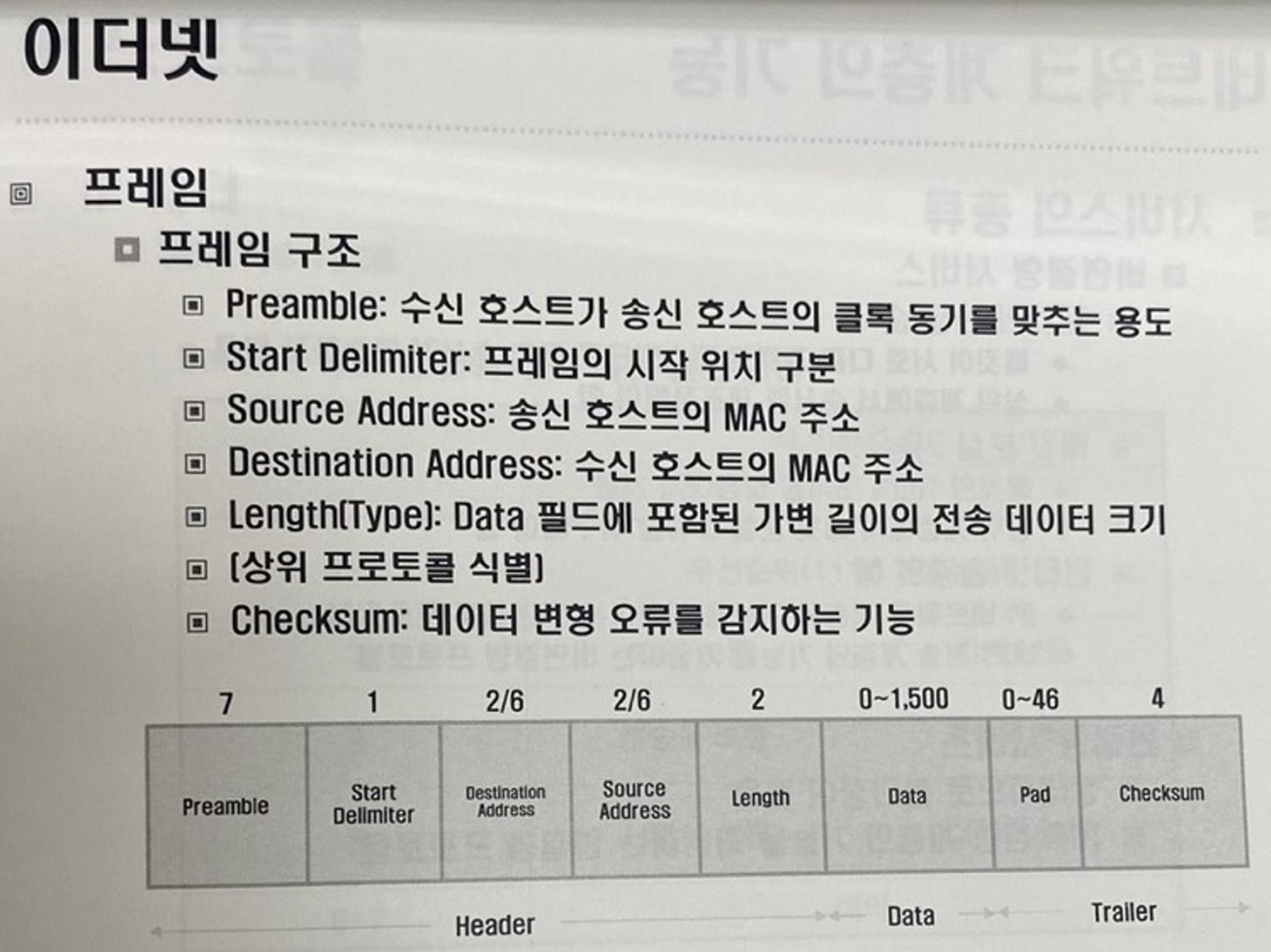 preamble : 데이터가 가기 전에 미리 알려주는 것 = (수신 호스트가 송신 호스트의 블록 동기를 맞추는 용도)