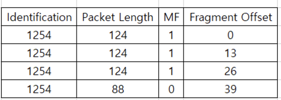 Fragment Offset: 8바이트로 나눠져야함/ 패킷의 최대 크기 128바이트에서 헤더 20 떼고 108바이트에서 8로 나눴을때 정수로 떨어지게 하기 위해 104바이트로 줄임 → 이값을 8바이트 단위로 나누면 104/8 = 13
