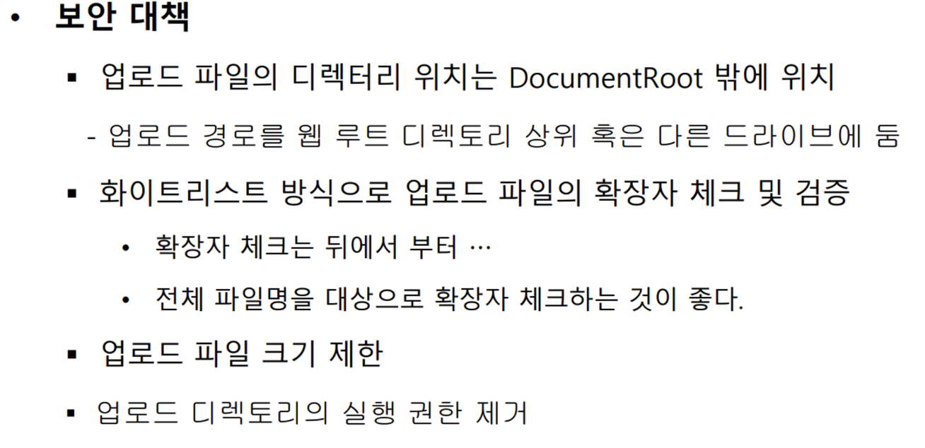 파일이 첨부되서 올라오는지를 잘 확인해야함 - 공격자는 웹 쉘을 업로드해서 모든 정보를 열람 가능하게 만들 수 있다.