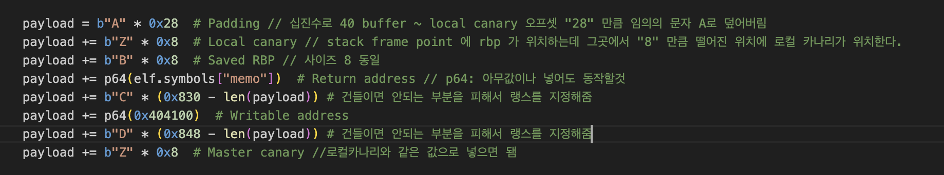 로컬 카나리까지만 덮으면 전역카나리와 비교 후 값이 달라서 에러가 나는 것 확인