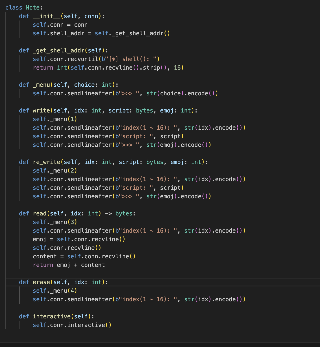 self.conn.sendlineafter(b"script: ", script) // script 입력받는 출력이 나오면 시크립트를 작성한다.