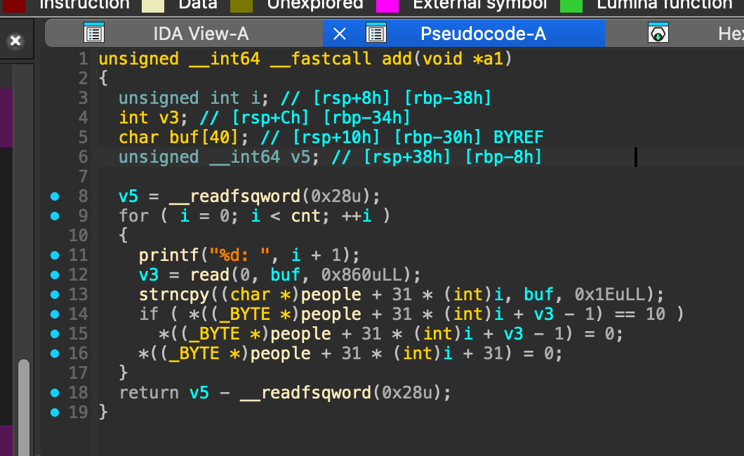 바이너리 파일을 실행시켜 문제가 어떻게 돌아가는지 점검을 해보니 문자를 넣을 수 있는 구간은 1번 add 기능과 3번 winner기능인 것으로 확인되었다.