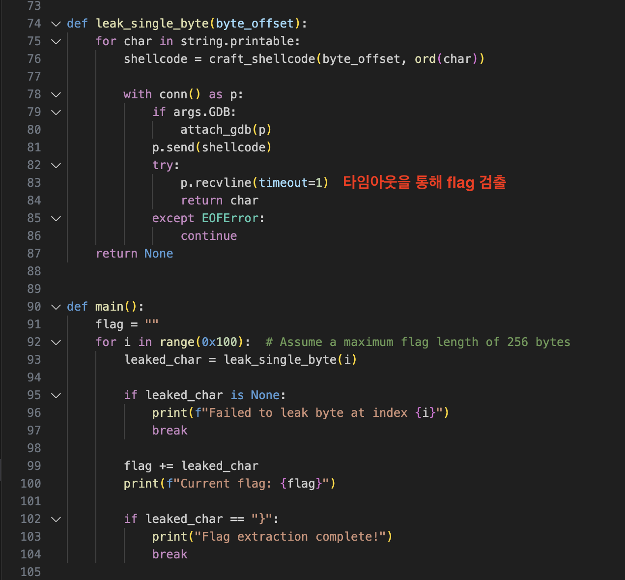 아래와 같은 shellcode를 통해서 한 문자열씩 비교해가면서 flag 를 추출할 수 있다.