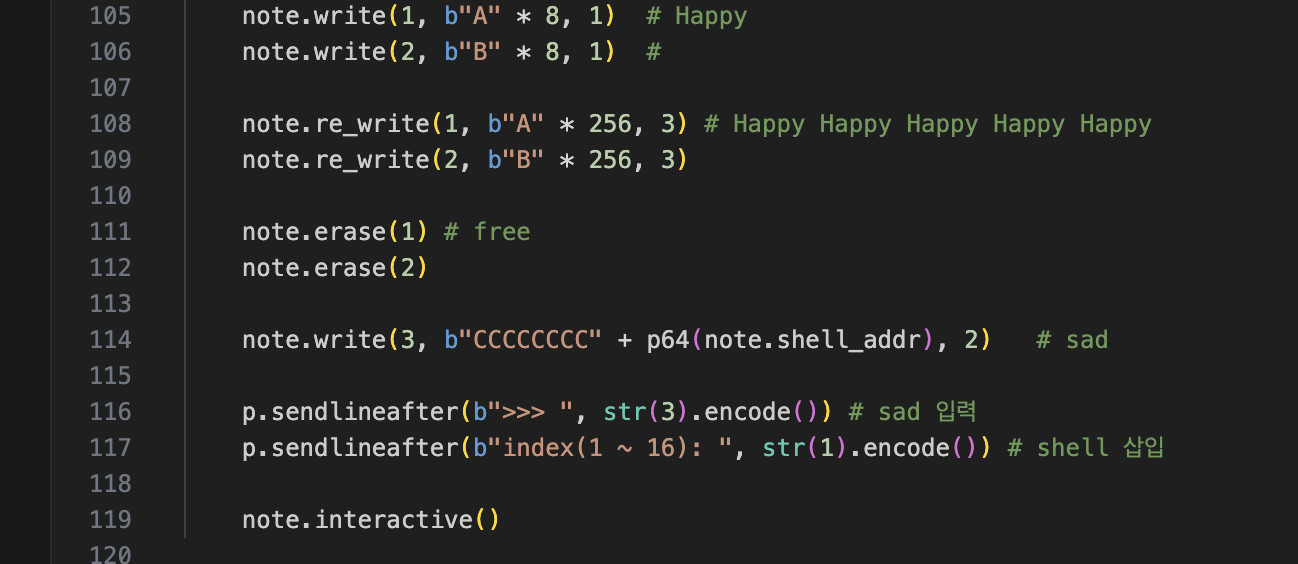 self.conn.sendlineafter(b"index(1 ~ 16): ", str(idx).encode()) // index(1~16) 입력받는 출력이 나오면 입력값 idx 를 받는다
