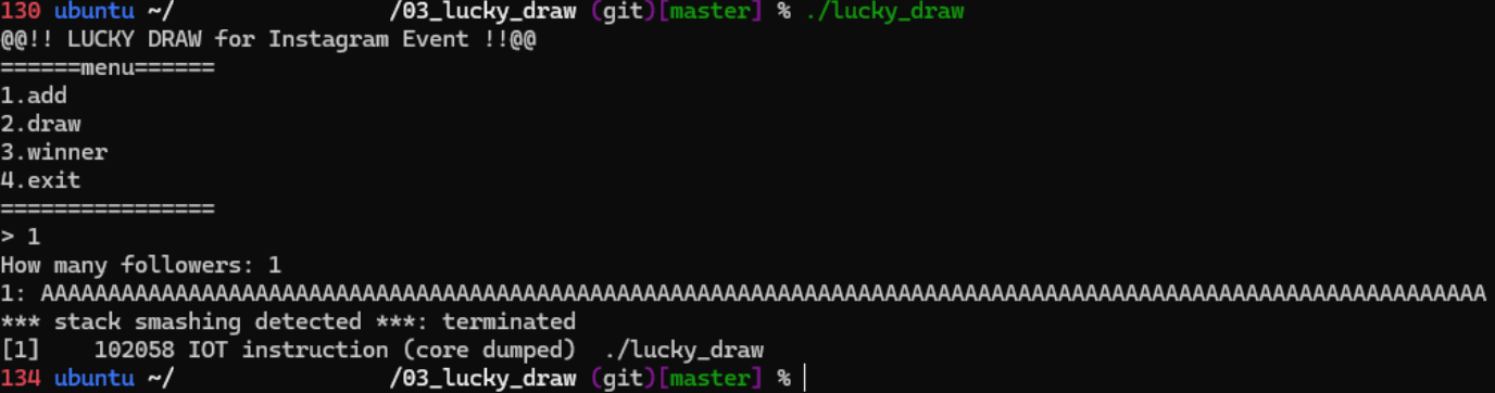 버퍼오버플로우가 발생하고 카나리가 프로그램을 자동으로 종료시켜주는 것을 확인 할 수 있다.