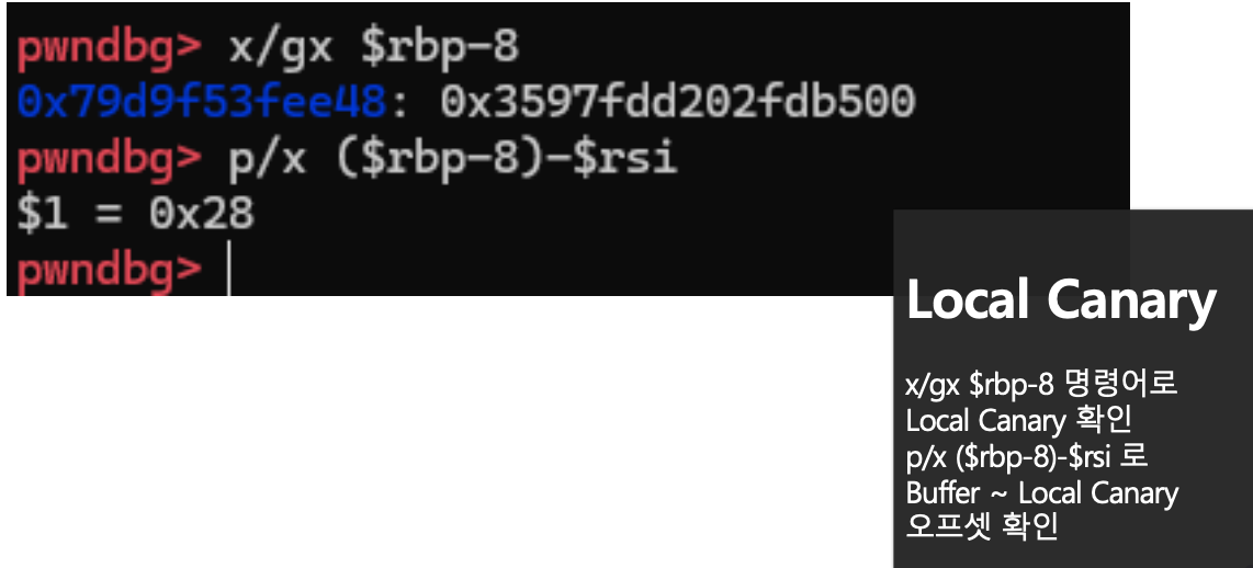x/gx $rbp-8 명령어를 통해서 로컬 카나리 확인이 가능하다.